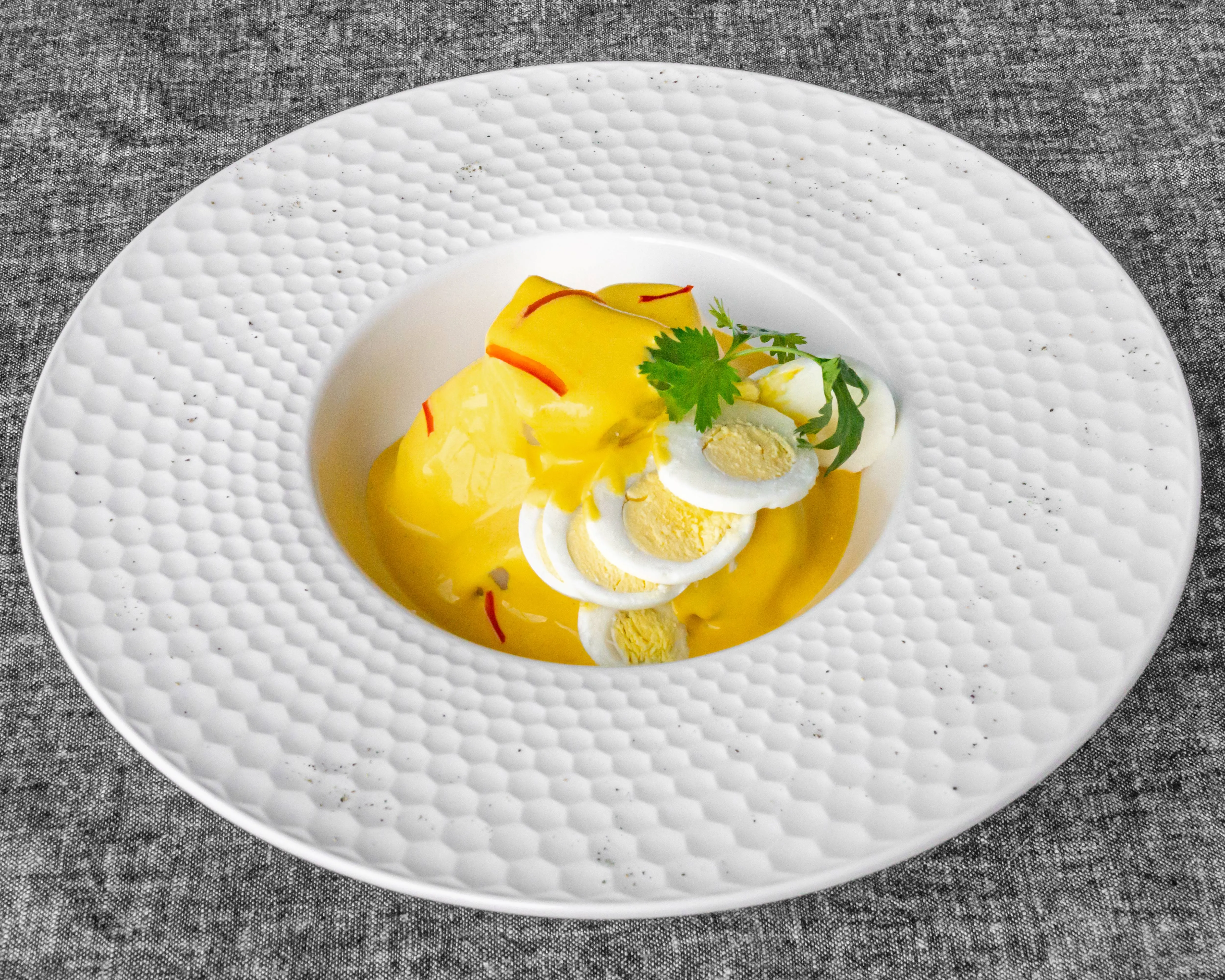 Boiled Potatoes Smothered In A Yellow Pepper And Cheese Creamy Sauce.