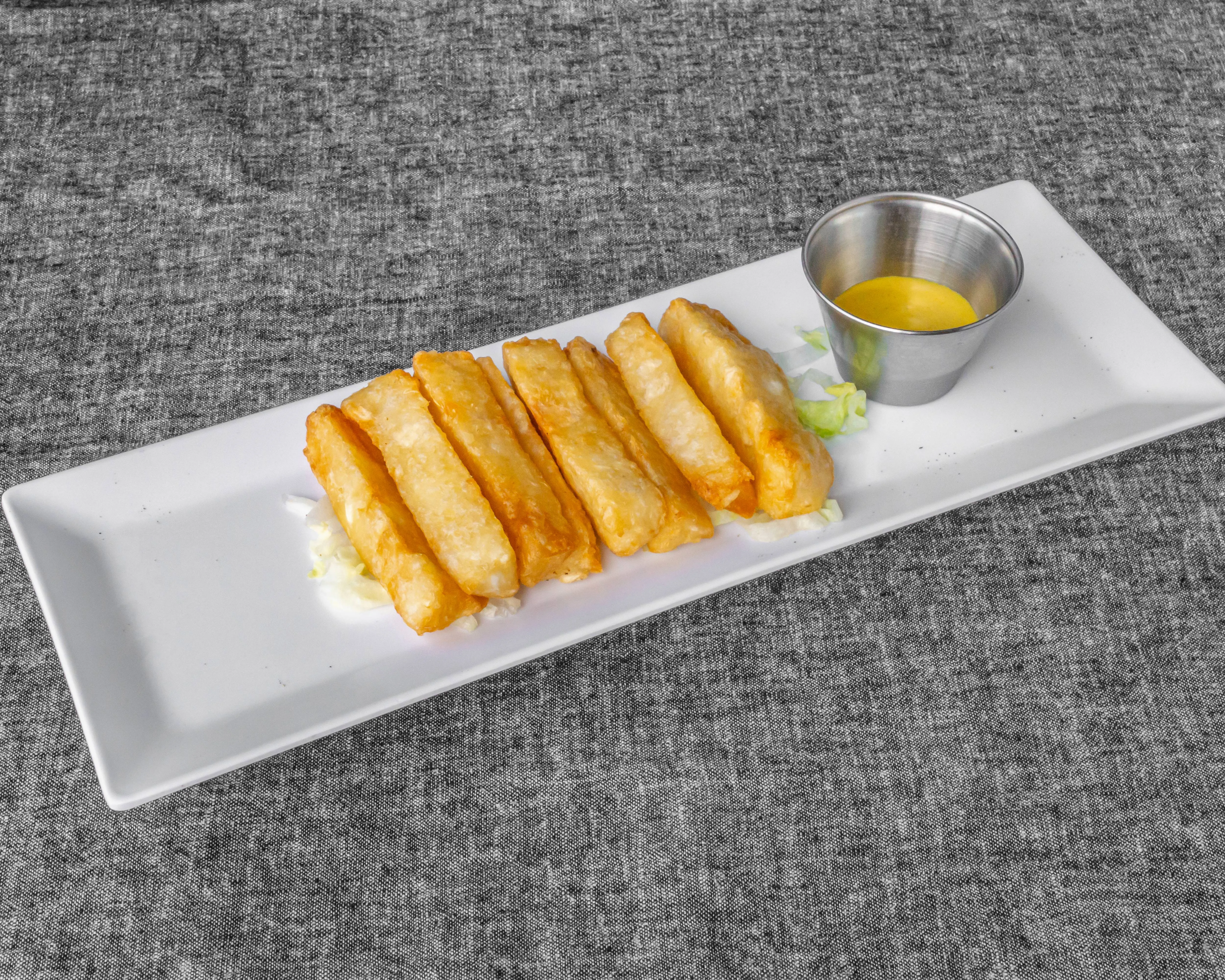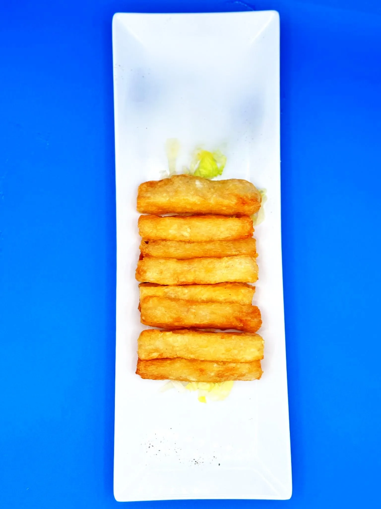 Fried Yucca Smothered In A Yellow Pepper And Cheese Creamy Sauce.
