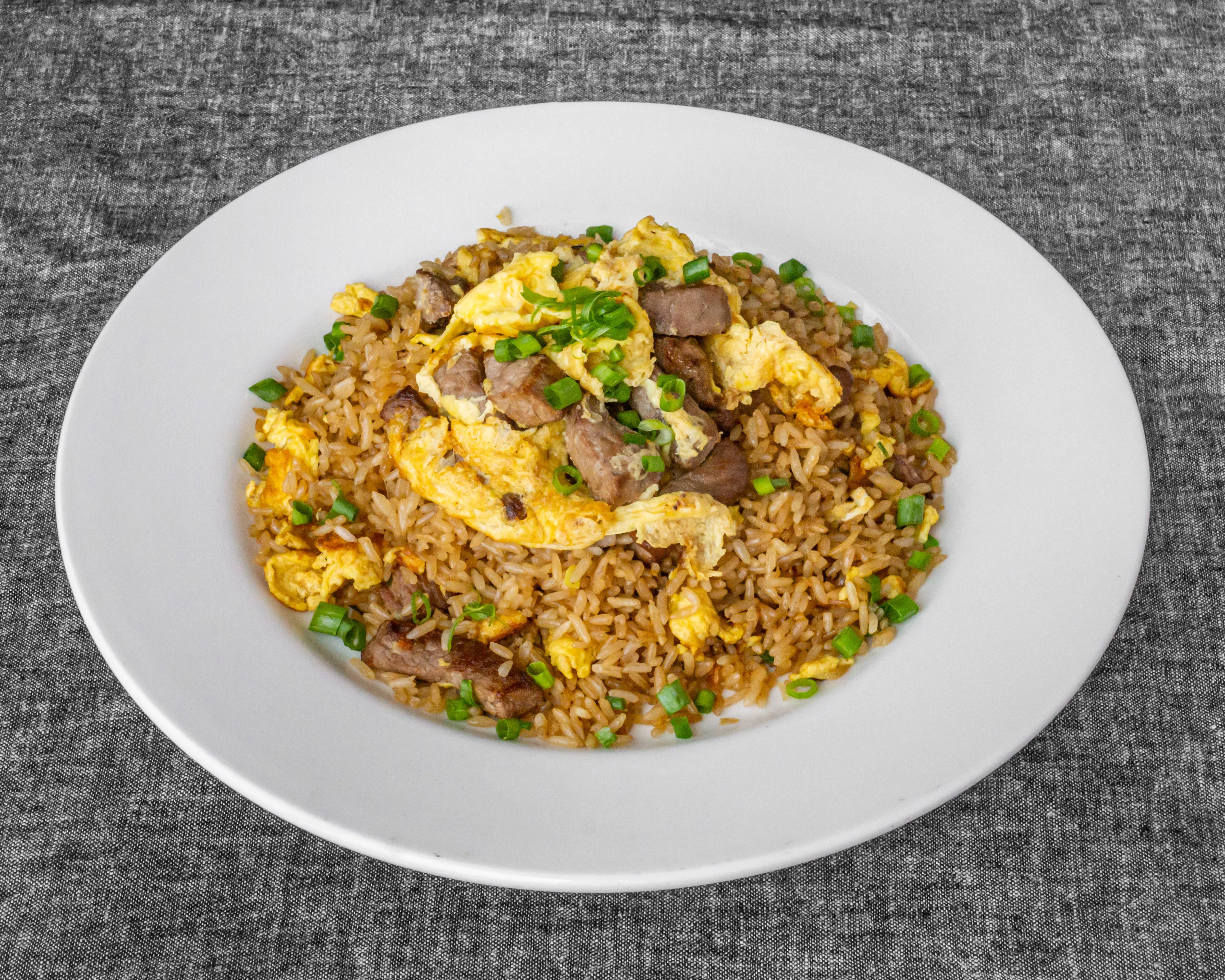 Peruvian Stir-Fried Rice Consisting Of Steak Strips, Eggs, Green Onions, Soy Sauce And Sesame Oil. Dairy Free