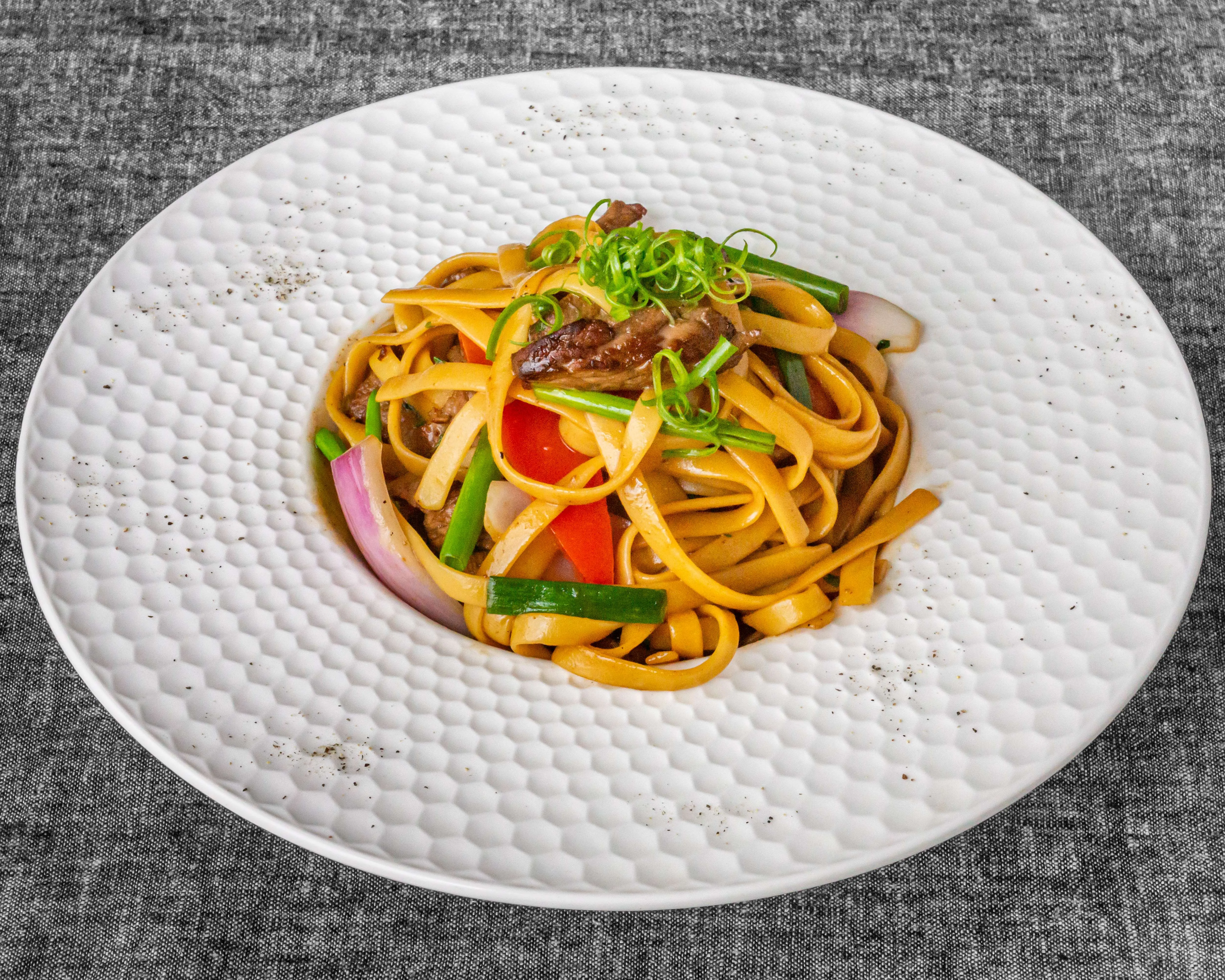 Seasoned Noodles, Sauteed With Onions And Tomatoes That Use Peruvian Ingredients Combined With Asian Influences, Served With Steak Strips. Dairy Free