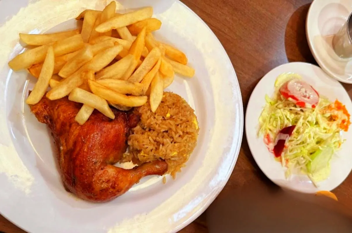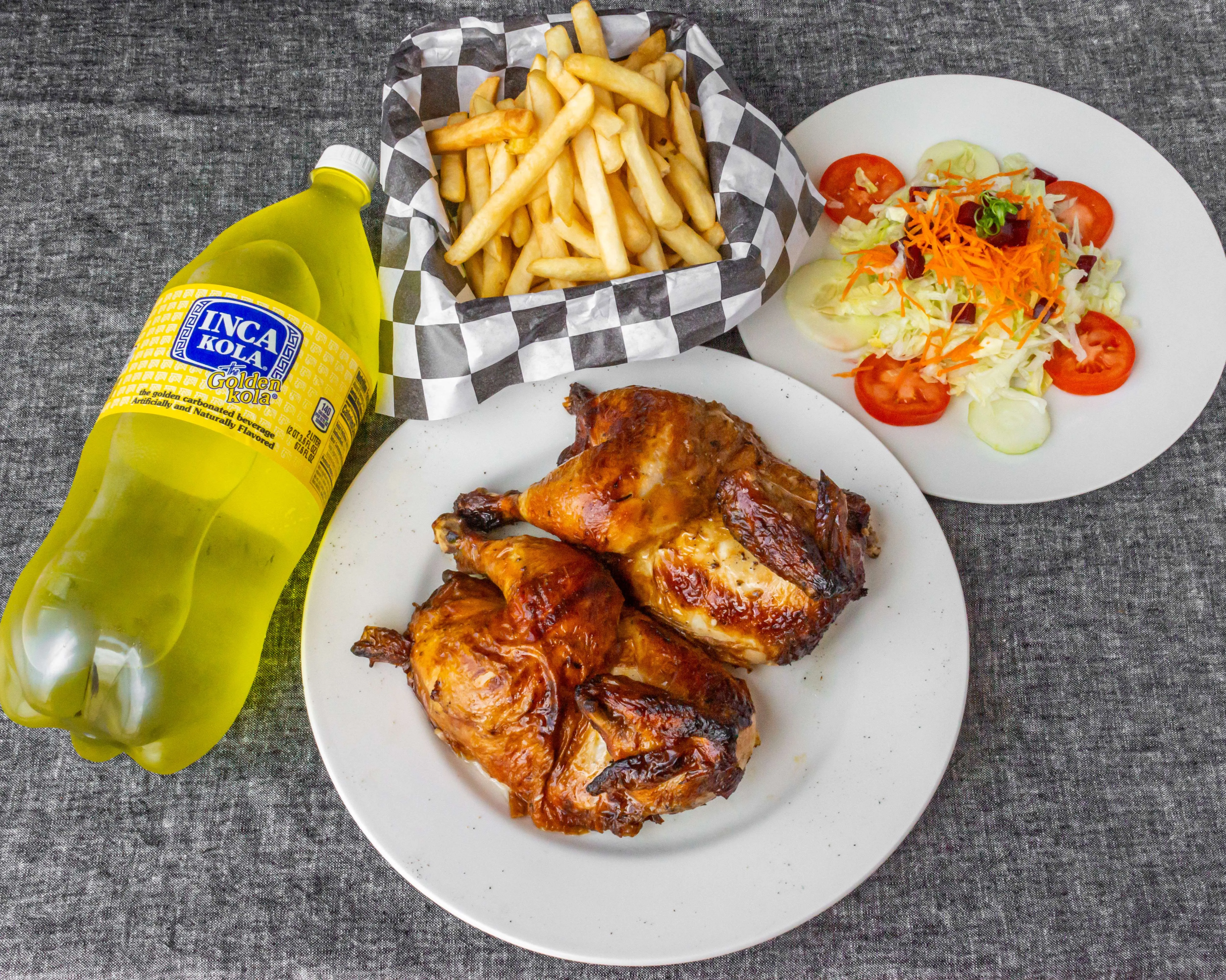 Whole Rotisserie Chicken, French Fries, Salad and 2 liters Inca kola.