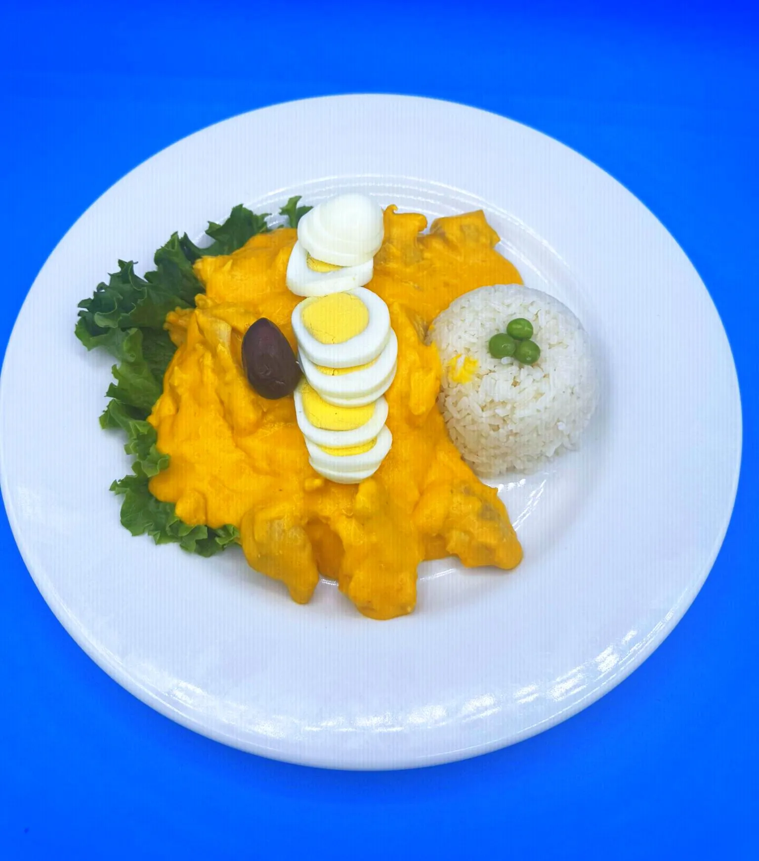 Traditional Dish With Shredded Chicken With A Light Spicy And Creamy Sauce On Top Of Boiled Potatoes And Side Of Rice. Gluten Free