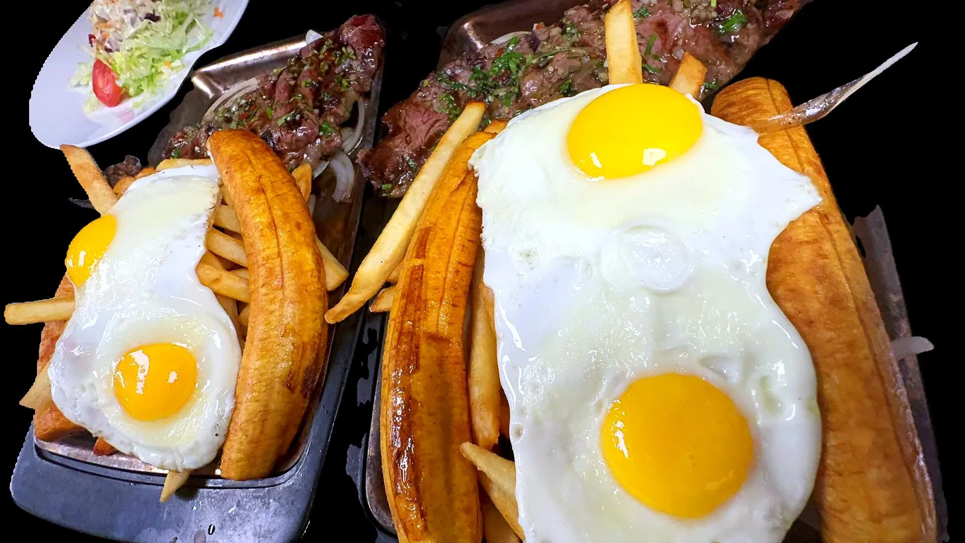 Classic lomo saltado that adding fried eggs and sweet plantains, make it more contundent and delicious.