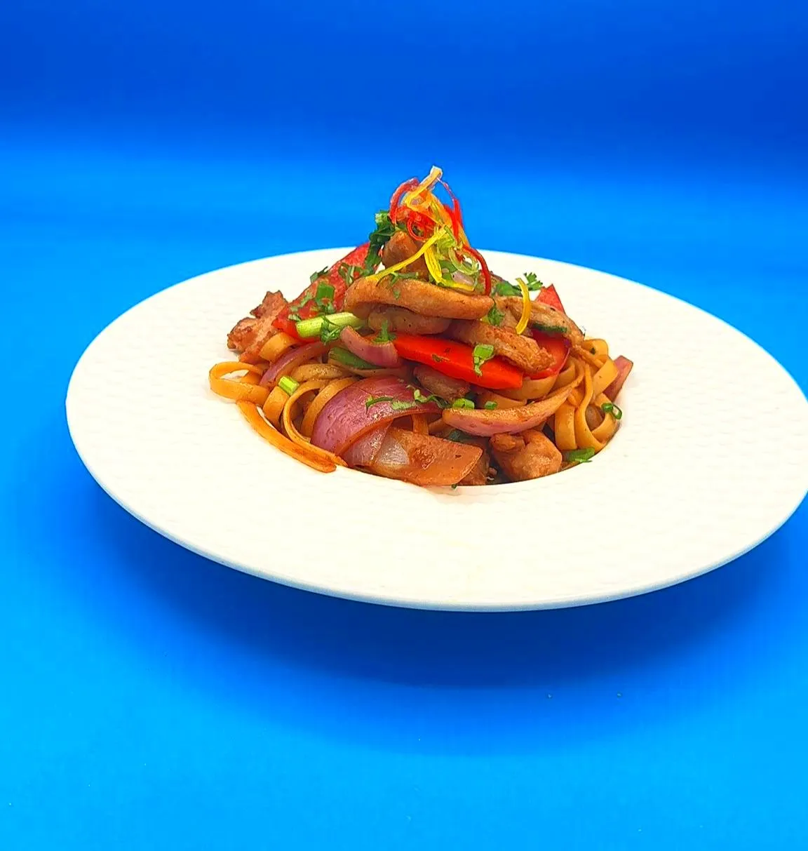 Seasoned Noodles, Sauteed With Onions And Tomatoes That Use Peruvian Ingredients Combined With Asian Influences, Served With Chicken Strips.Dairy Free
